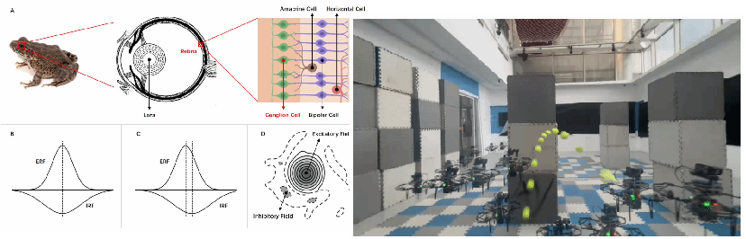 毫秒级仿生动态规避机制:借鉴蛙眼视神经感受野对运动物体的感受机制,提出基于脉冲神经网络的高速动态障碍物响应算法,无需进行目标识别或轨迹计算,在2.3毫秒超低延迟下可规避速度高达10 m/s的移动障碍物;
